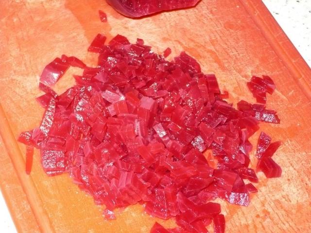 - Las remolachas (0,2 kg) se pelan y se cortan finamente en tiras o cubos. Puede moler verduras en un rallador o en una licuadora.