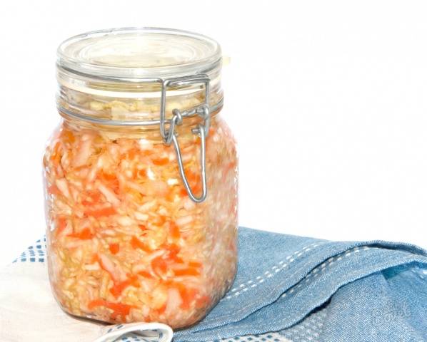 - El proceso de fermentación tiene lugar dentro de las 4 horas, después de lo cual se puede servir el repollo. Los espacios en blanco se almacenan en frascos, que se colocan en un refrigerador o en el sótano.