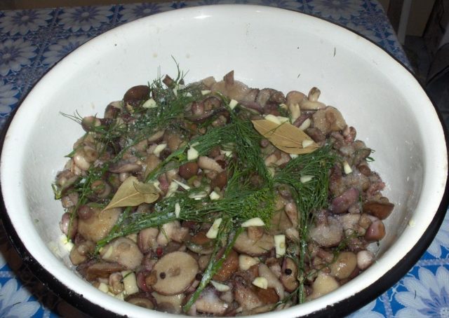 Se vierte un poco de sal en el fondo de una olla pequeña de esmalte, luego se colocan capas de champiñones, espolvoreando cada una con especias, hojas y ajo picado. Toda la masa está sometida a opresión durante 24 horas. Después de esto, el boletus se coloca en un frasco esterilizado y se vierte con el jugo formado durante el día. El frasco se lleva a un lugar fresco durante 2-3 semanas.