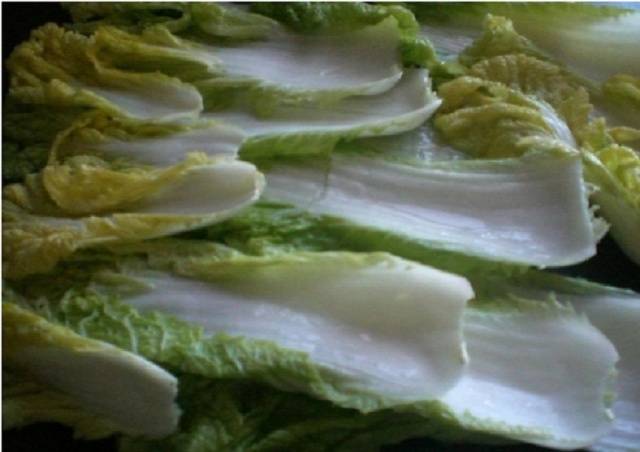 - Una vez que se escurre el agua, abanique las hojas de col de Pekín y frótelas con sal de mesa. Para hacer la salazón más uniforme, mojamos los cuartos en agua, sacudimos el exceso de humedad y luego frotamos.