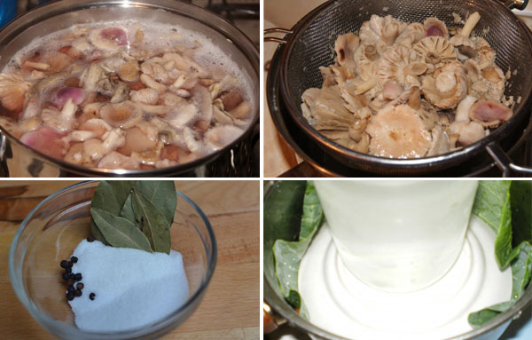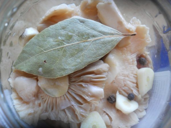 La pimienta, el ajo picado, el eneldo y las hojas de laurel se mezclan en un recipiente aparte. Esta mezcla se combina con champiñones hervidos y se coloca en frascos. Cada frasco se tapa herméticamente con una tapa y se envía a un lugar fresco. El plato terminado no es muy salado, pero al mismo tiempo tiene un delicioso aroma.