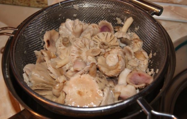 Los champiñones previamente remojados se envían a agua hirviendo con sal durante 8 minutos. Deben agitarse constantemente y eliminar las incrustaciones acumuladas. Después de eso, se arrojan a un colador.