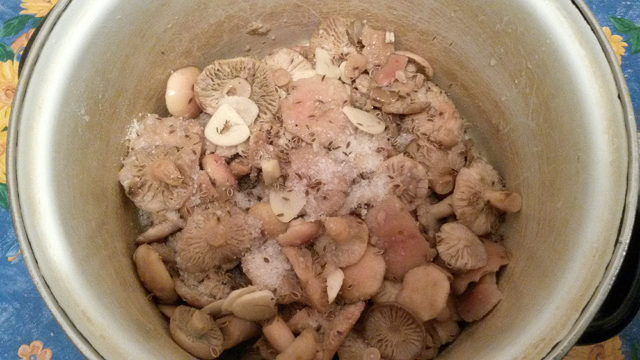 Las setas se salan en macetas esmaltadas, frascos de vidrio o cubos de madera. Las verduras y las especias se colocan en el fondo del recipiente. Luego se les pone una capa del ingrediente principal y se les espolvorea generosamente con sal. Las capas se alternan, luego se espolvorean con especias adicionales en la parte superior. Para salar toda la masa más rápido, la someten a opresión y la envían a un lugar fresco. Después de una semana, el plato está listo para comer.