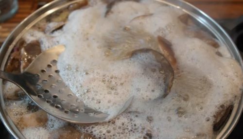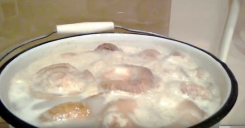 - Cocine hasta que los champiñones se sumerjan en el fondo y el agua esté clara. Durante la cocción, retire periódicamente la espuma. Retire los champiñones de leche con una espumadera, colóquelos en un colador.