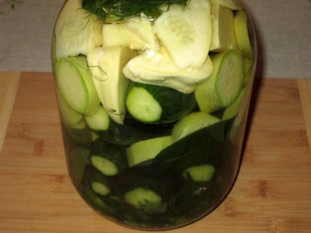Los pepinos se preparan de forma estándar cortando los extremos y remojándolos previamente. La calabaza está pelada, cortada a tu gusto. En el fondo del frasco o sartén debe poner una hoja de rábano picante, ajo y eneldo. El ajo puede ser entero, pero es mejor cortar cada diente por la mitad. Primero esparcimos los pepinos, luego la calabaza en trozos.