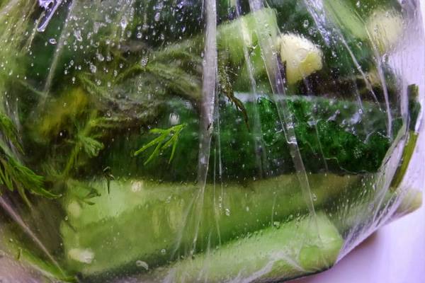 Utilice una bolsa de plástico grande como recipiente. Los pepinos se lavan previamente, se cortan las colillas y se colocan en plástico. Vierta sal, después de lo cual la bolsa se cierra y se agita bien para que la sal se distribuya uniformemente.