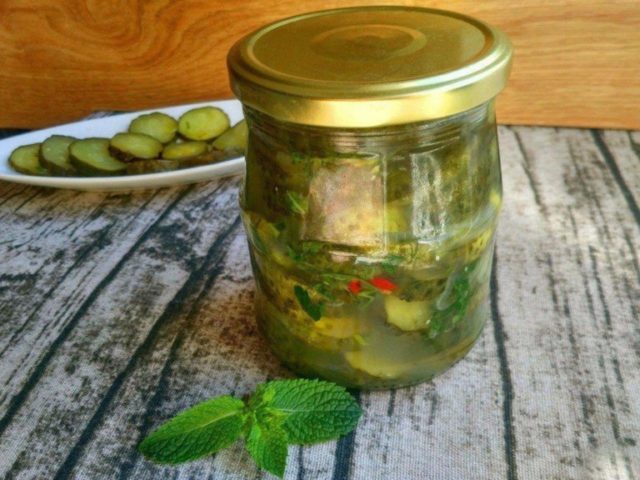 Esta es otra receta original para un refrigerio frío fragante. La adición de menta al encurtir pepinos con albahaca para el invierno afecta el color de la marinada, haciéndola verdosa.