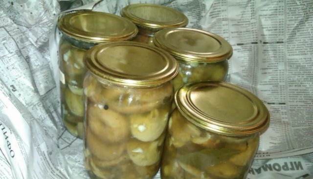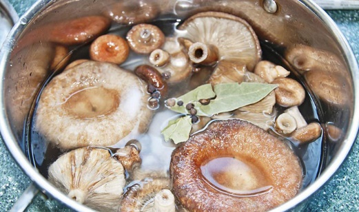- La salmuera con champiñones se deja enfriar y luego se vierte en frascos.