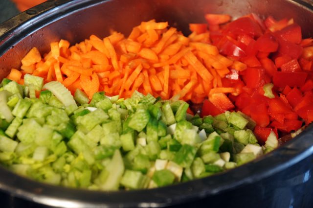 - Agrega los pimientos, las zanahorias y las cebollas, finamente picados de antemano, mezcla y mantén en el mismo modo por otros 15 minutos.