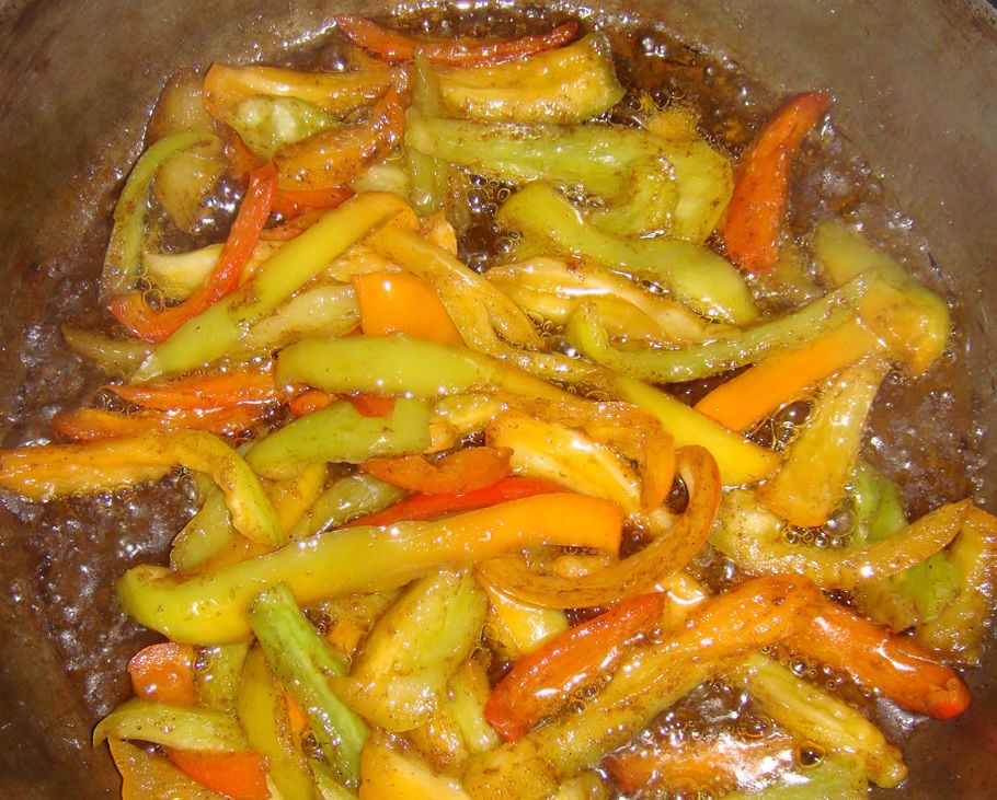 - Las cebollas y los pimientos picantes se cortan finamente y se fríen.