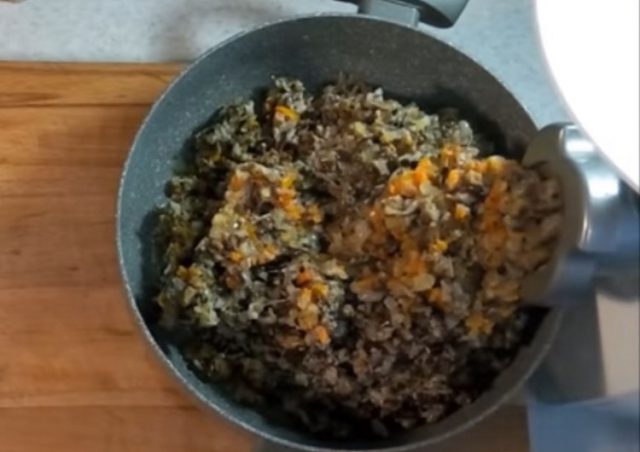 Las verduras se cortan o rallan, se fríen una a una o todas juntas en una sartén con aceite refinado. Freír todos los componentes por separado aumenta el tiempo de cocción, pero mejora el sabor del caviar de champiñones.