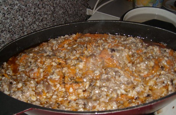 - Picar las cebollas y las zanahorias y sofreírlas sucesivamente, añadiéndoles al final pasta de tomate y especias.