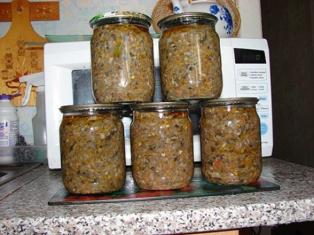 Después de picar los champiñones y otros ingredientes, coloque todo en un recipiente grande (cacerola, cacerola con fondo grueso, sartén profunda), agregue aceites, agregue especias o condimentos y cocine a fuego lento bajo una tapa durante aproximadamente media hora: una hora después de hervir. El líquido debe evaporarse por completo, pero el caviar no debe quemarse. Por lo tanto, la pieza de trabajo debe mezclarse de vez en cuando.