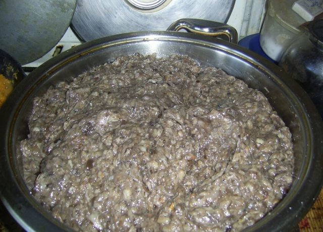 En la siguiente etapa, todos los componentes del futuro caviar, incluidos los champiñones, se pasan a través de una picadora de carne. Se permite hacer esto a su vez en un recipiente, o puede mezclar inmediatamente los champiñones con verduras fritas. Esto no cambiará el sabor del caviar de hongos. No necesita moler los componentes del caviar con una picadora de carne, simplemente pique los champiñones con un cuchillo y mezcle con verduras. Pero el caviar de hongos de los agáricos de miel a través de una picadora de carne resulta ser más tierno y homogéneo en composición.