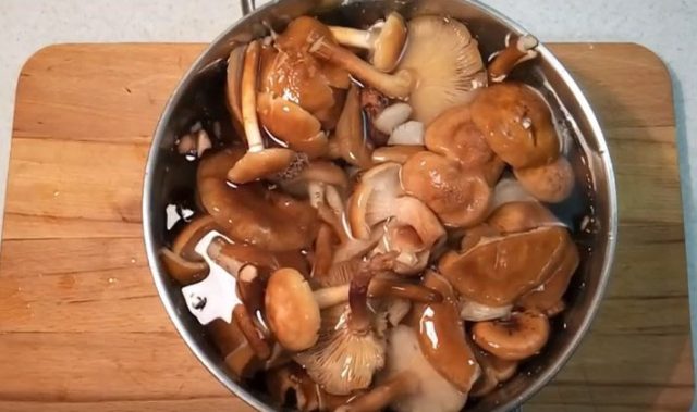 - Las setas de miel se lavan y se hierven en agua con sal.