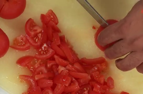 - Los tomates se cortan de cualquier manera conveniente y se combinan con champiñones picados antes de guisarlos.