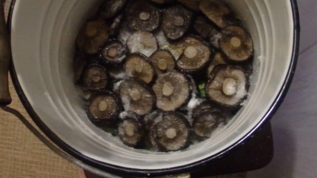 Una de las opciones para salar los champiñones es remojarlos solo después de hervirlos. Debe cocinar durante 15 minutos, luego mantenerlo en salmuera a presión durante una semana. Después de dicho procesamiento, los hongos de leche se colocan en frascos esterilizados y se llevan a un lugar fresco durante 1-1.5 meses.