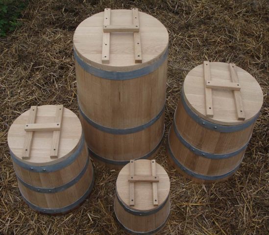 Habrá un poco más de alboroto con los contenedores de madera. En cualquier caso, es necesario remojarlas en agua durante varios días para que la madera se hinche y se vuelva impermeable. Las tinas de roble nuevo deben remojarse durante al menos 2 semanas para eliminar completamente los compuestos tánicos, de los cuales los hongos y la salmuera pueden volverse negros.