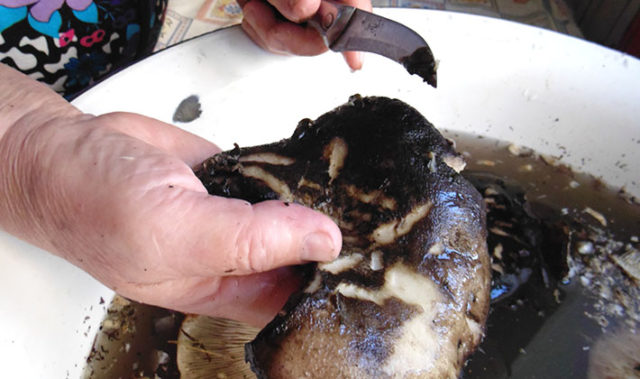 Dado que las cabañas negras crecen en lo más espeso de la basura del bosque, se acumula mucha basura natural en ellas. Por lo tanto, el procedimiento para limpiarlos de los escombros es muy importante.Para eliminar completamente toda la suciedad, use una esponja, un cepillo rígido e incluso un cuchillo de cocina cuando necesite raspar las áreas más difíciles.