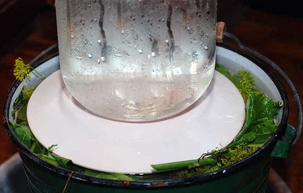 - Cubra los hongos con una gasa u otro paño de algodón, presiónelo en la parte superior con un círculo de madera, sobre el cual se coloca la carga. Es más fácil usar un frasco de vidrio lleno de agua como carga.