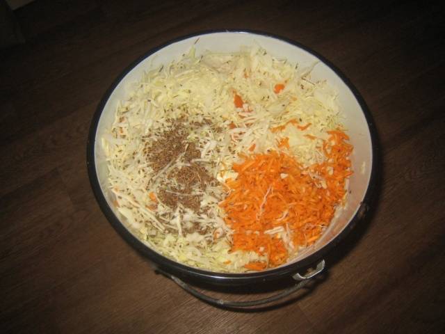 - El repollo y las zanahorias se colocan en un recipiente aparte. Para hacer el bocadillo más sabroso, agregue semillas de eneldo (3 cucharadas. L.). Mezclar bien los ingredientes.