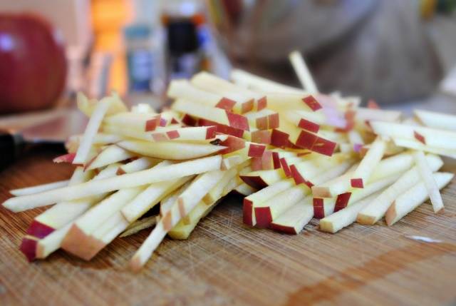 - Las manzanas se cortan en rodajas pequeñas, después de quitarles el corazón. Para el decapado, necesita 0,5 kg de manzanas.