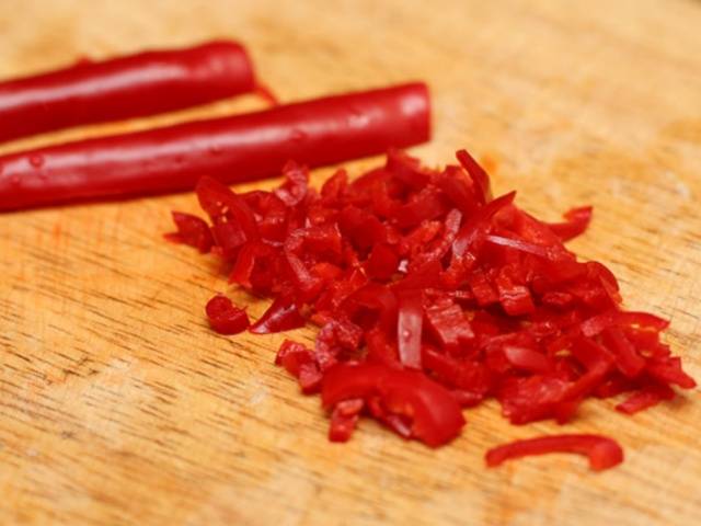- La vaina de pimiento picante se quita de las semillas y luego se tritura. Cuando trabaje con pimientos picantes, debe tener cuidado de no dejar que entre en contacto con la piel y las membranas mucosas.
