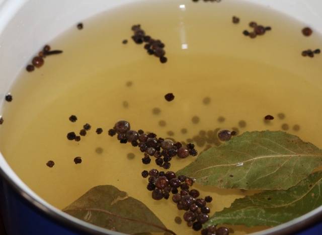 - Luego proceda a la salmuera. Disuelva 0,1 kg de sal, medio vaso de azúcar en una cacerola con agua, agregue 4 hojas de laurel, 2 paraguas de clavo y 8 guisantes de pimienta gorda.