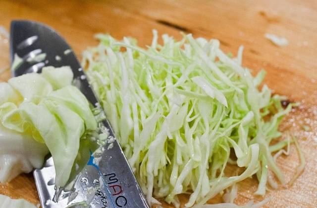 - Durante este tiempo, debe preparar el repollo, que requerirá aproximadamente 3 kg. Las cabezas de repollo deben lavarse, quitarse las hojas marchitas y dañadas y luego cortarse finamente.