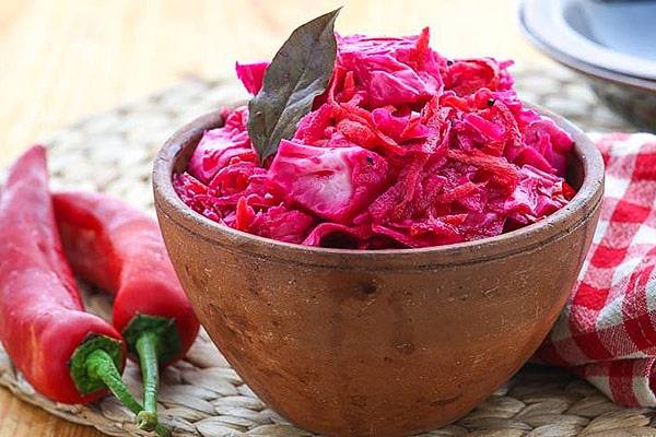 El chucrut tradicional es una ensalada finamente picada. Para picar verduras durante el proceso de cocción, la anfitriona toma mucho tiempo. Más fácil salar el repollo en trozos grandes... Un aperitivo con tal corte seguramente se convertirá en un objeto de sorpresa para los demás, especialmente si su color es rosa brillante. Es este tipo de repollo salado el que proponemos cocinar para el invierno.