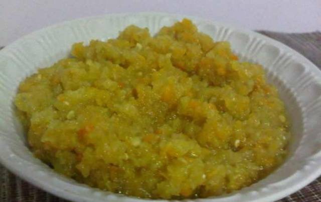 Además, es necesario moler adicionalmente aproximadamente 2 kg de tomates verdes con una picadora de carne, para obtener 3 vasos de pulpa con jugo. Mezcle esta pulpa junto con otros ingredientes en un recipiente aparte.
