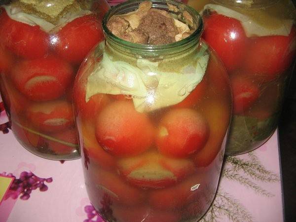 Curiosamente, los tomates en escabeche se pueden preparar casi de la misma manera. La receta para hacer la marinada es la siguiente: para 4,5 litros de agua, tome tres cucharadas de sal, azúcar, vinagre de mesa y aceite vegetal. Esta cantidad de adobo es suficiente para hacer unas 3 latas de tomates de tres litros. Elija especias según su gusto. Después de hervir la marinada con sal y azúcar, agregue allí 2 cucharadas de mostaza, vinagre y aceite vegetal. Después de enfriar, vierta la marinada sobre los tomates en los frascos, colocados junto con las especias. Para el almacenamiento a largo plazo en condiciones ambientales, los frascos con el contenido deben esterilizarse adicionalmente durante unos 20 minutos.