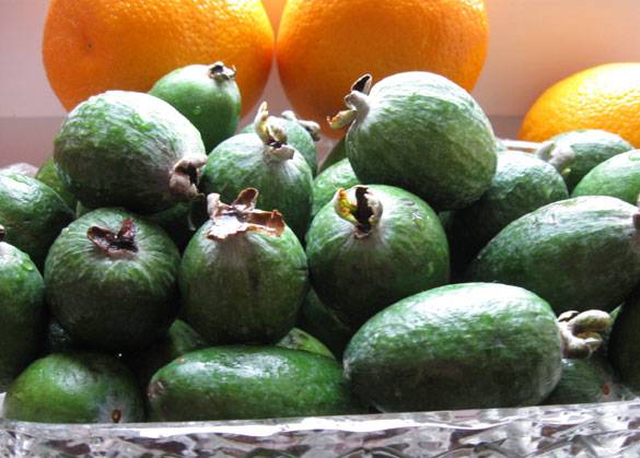 Patria feijoa - el sur del continente africano. Para nosotros, esta baya, que se asemeja a las fresas y al kiwi en aroma y sabor, es exótica. Las frutas tropicales son valoradas por su alto contenido de yodo, vitamina C, sacarosa, pectina, fibra y diversos ácidos orgánicos.