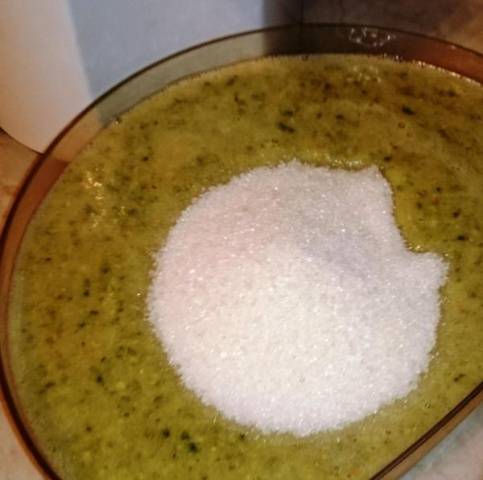 Como puede ver, la feijoa triturada tiene un contenido mínimo de azúcar según la receta. Y esto ya es un peligro para el almacenamiento. Por lo tanto, debe mirar en el refrigerador y verificar si la fermentación está comenzando.