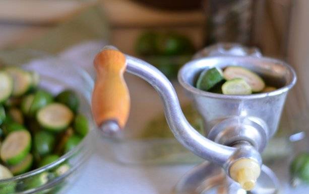 - En una picadora de carne, la transformación de las bayas en puré de papas es más rápida y la masa es homogénea. Pero aquí hay algunas complicaciones. Una picadora de carne eléctrica no se usa para tales fines, ya que la piel dura de la feijoa obstruye la picadora de carne y el cuchillo no hace frente a su tarea y pierde su filo. La pulpa con jugo llena el interior de la picadora de carne y debe seleccionarse a mano. Si no tiene una picadora de carne común, entonces debe usar una malla con agujeros grandes y tirar las bayas poco a poco.