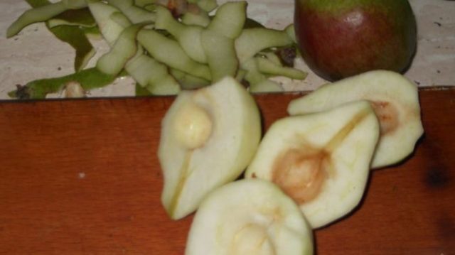 - Las peras se lavan, se cortan en mitades y se liberan de todos los detalles innecesarios: colas, semillas y cáscaras.