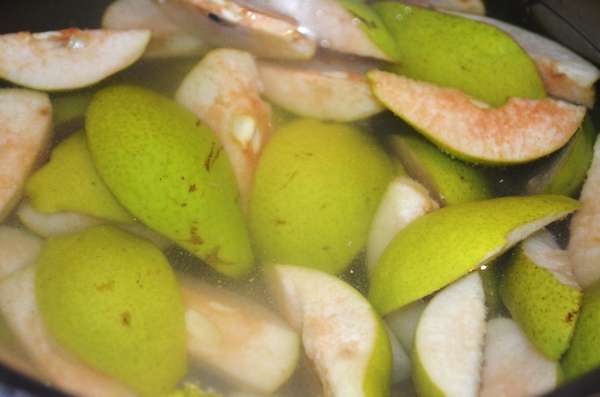 - Se colocan en él mitades de peras y, una vez reducido el fuego, se cuece durante aproximadamente una hora hasta que los frutos adquieran cierta transparencia.