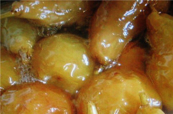 - Las peras con jengibre se vierten con almíbar caliente y, revolviendo y desnatando, se cuecen durante aproximadamente una hora a fuego lento.
