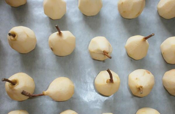 - Las peras se lavan, pelan y pelan con un dispositivo especial.