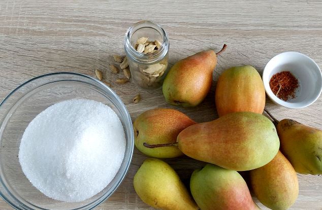 - Durante la noche, las peras deben liberar una cantidad suficiente de jugo. Agregue cardamomo y azafrán, caliente y cocine durante unos 10 minutos, revolviendo constantemente el contenido del recipiente.
