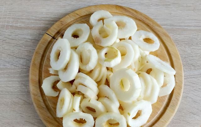 - Las colas, las semillas y la cáscara se quitan de las peras, se cortan en rodajas de forma arbitraria.