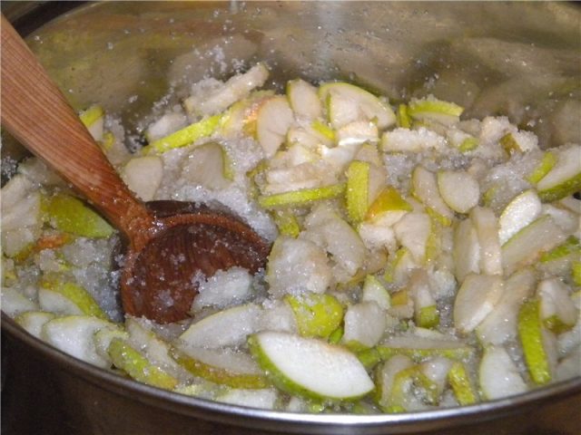 - En un tazón grande, coloque en capas: azúcar, una capa de peras, nuevamente azúcar derramada con jugo de limón, una capa de peras, etc.