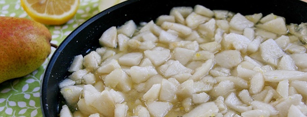 - Ponga trozos de pera en una sartén seca, espolvoree con azúcar y agregue jugo de limón exprimido y ralladura picada.
