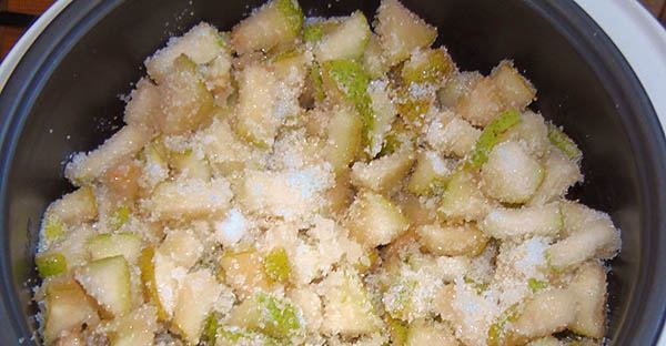 - Los cubos se colocan en un recipiente multicocina, se cubren con azúcar y se enciende el modo "Guisado" durante 1 hora.