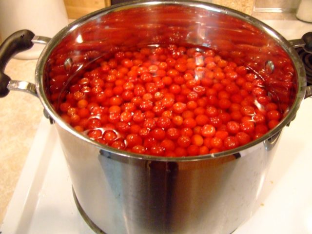 - Envíe a hervir a fuego lento. Tiempo de tratamiento térmico: 30 minutos después de hervir. Asegúrese de revolver periódicamente la masa de cereza y quitar la espuma.