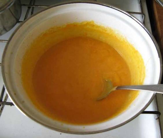 Lave la calabaza, pélela, cocine a fuego lento hasta que esté suave con la adición de agua, conviértala en puré con una licuadora.