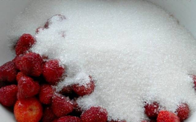 Antes de comenzar a cocinar golosinas de fresa de acuerdo con esta receta, debe pelar las fresas de las hojas, enjuagarlas y mezclarlas con azúcar en un recipiente hondo de esmalte. Para que las bayas den todo su jugo, deben dejarse azucaradas durante la noche a temperatura ambiente.