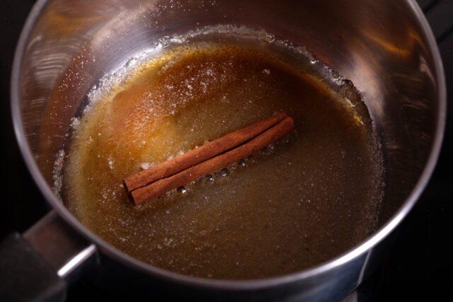 - En un cazo hervir el almíbar de azúcar y agua, añadir una ramita de canela, vainilla o unas estrellas de anís.