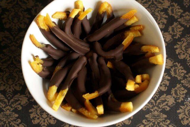 Las cáscaras de mandarina confitadas se convierten en dulces cuando se sumergen en chocolate derretido.