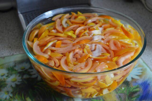 La cáscara de los cítricos está lista para azucarar después de remojarla en agua fría. Las cáscaras de mandarina se hincharán un poco, el amargor desaparecerá. El líquido se drena, en su lugar se agrega jarabe.